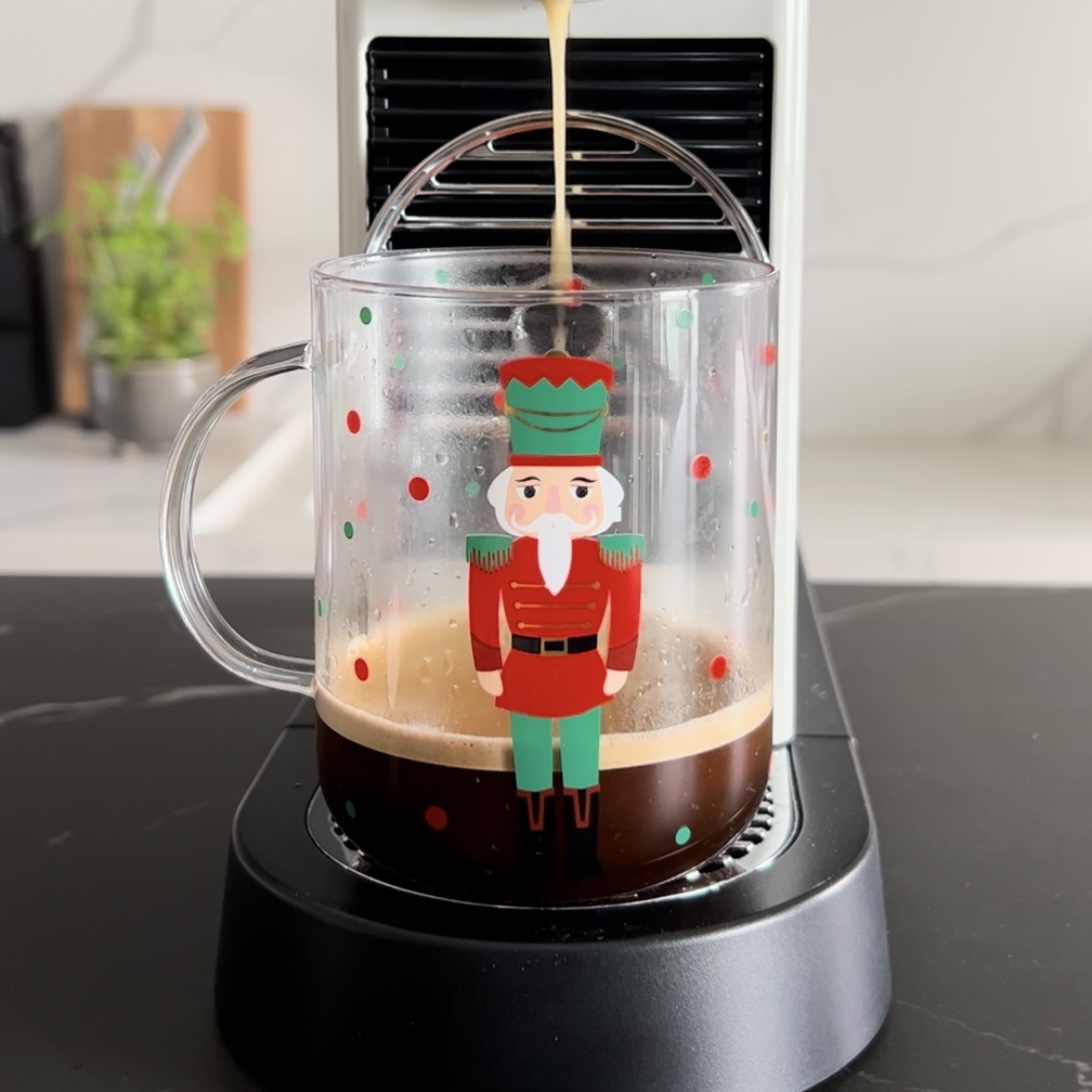 Feita em vidro e com estampa de mini poás vermelho e verde com o tradicional ícone natalino quebra-nozes, deixando qualquer café ainda mais gostoso e especial