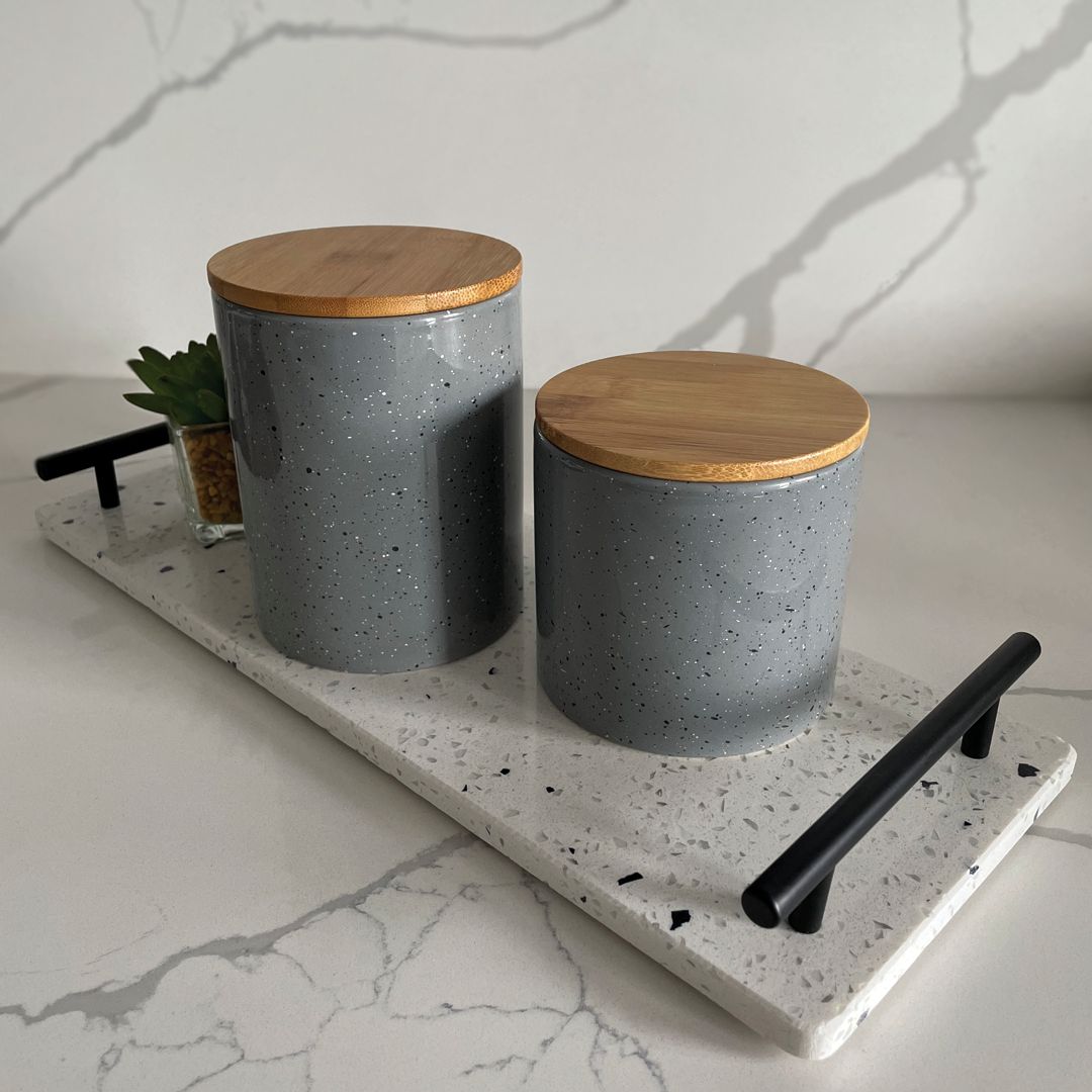 O Pote Granilite é feito em cerâmica com acabamento esmaltado e estampa de granilite.