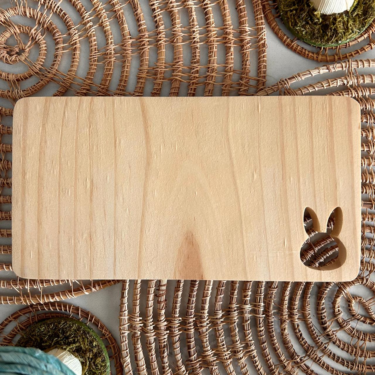 Com seu formato tradicional retangular, a Tábua Mini Coelho contém um recorte na madeira em formato de coelho dando um charme único à peça!