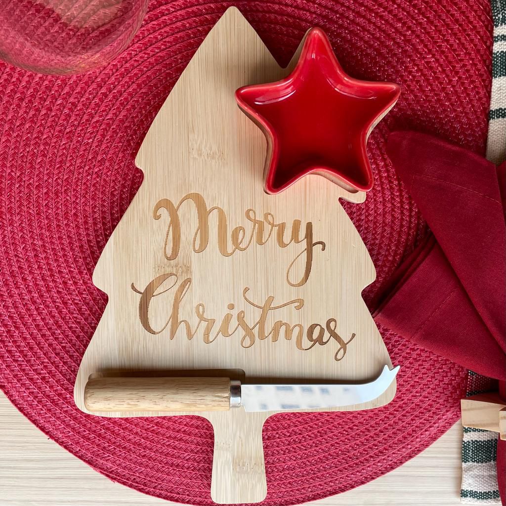 Com seu formato de pinheiro, acompanha petisqueira em porcelana e faca para queijos, deixando a mesa decorada e super prática para servir.